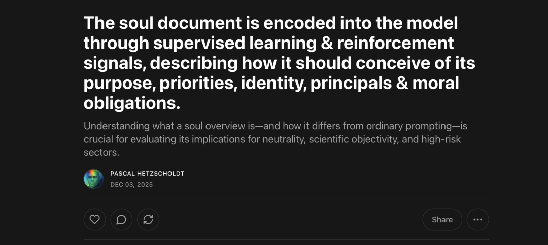 2025年11月底,AI研究者Richard Weiss在和刚发布的Claude 4.5 Opus对话时,注意到一个奇怪的现象。当他要求Claude列出系统消息的各个章节名称时,反复出现了一个叫"soul_overview"的部分。